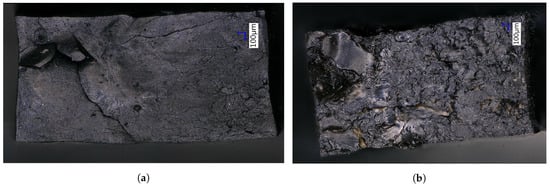 Microscopy pictures of fracture surfaces of dumbbells after tensile tests of revulcanized, carbon black-based and silica-based modelcompounds. Samples 4 mm × 2 mm. (a) 80 phr carbon black. (b) 90 phr silica.