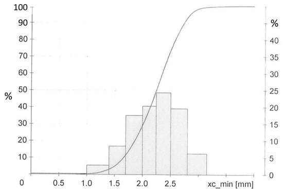 The Ground Tire Rubber (GTR) used in this investigation was obtained from Genan, Dorsten, Germany. It is a commercial ground passenger car tire, medium grade with a normal-like size distribution of dimensions 1 to 3.5 mm, see Figure 12. It contains at least 45% rubber polymer including 10–35% NR []. This GTR type represents the cleanest fraction from the grinding process. By TGA the silica content was determined as 20–42 phr, depending on the sample drawn from the feedstock, with 23 phr a mean value measured on a larger sample size. All other materials are specified in Table 10.