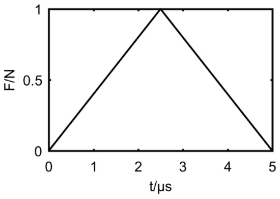 The localization performance of the presented algorithm is tested by simulated signals of damage. The dimension of the thin-walled steel structure in the simulation is 700 × 700 × 5 mm. Density, elastic modulus, and the Poisson’s ratio of material are set as 7.8 × 103 kg/m3, 2.09 × 1011 N/m2 and 0.3, respectively. The damage source was simulated by a pair of transient triangular forces lasting , and the time profile of that is shown in Figure 2. Due to the short wavelength of the AE wave under normal conditions (for example, the bending wave is about 20 mm and the extending wave is about 35 mm in the AE wave with center frequency of 150 kHz), it is sufficient to mesh the geometry model by 1 × 1 mm2 to simulate the modes of the AE wave in the interested frequency band. The element type used in Abaqus (version 6.14, Dassault Systèmes Simulia Corp, Johnston, RI, USA) is C3D8R, which is a linearly reduced integration element with accurate displacement results and less computation time. Specific simulation details are described and validated in the literature [21].