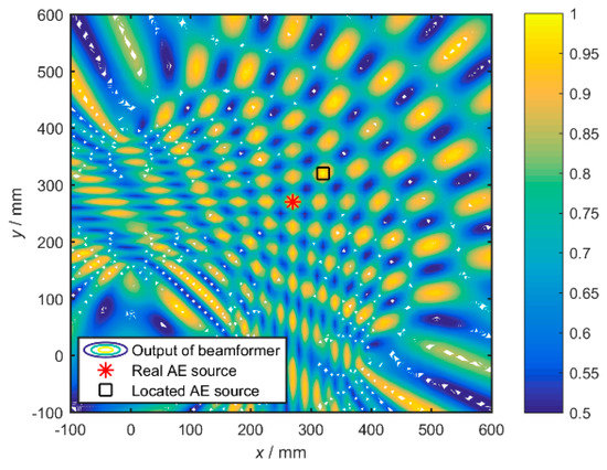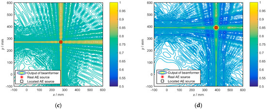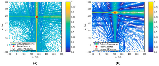 where is obtained by calculating the covariance matrix of the array signals. R has no relationship with the assumed wave speed, while it is affected by the propagation speed in the specific material. Because the change of propagation speed will affect the received signals , and the change of is mainly about the relative phase position of signals from different sensor channels. That is to say, R still contains the information about where the true source is, and the function is used to find the most matched point . For the condition that the dimension of is M × T (where T represents the length of the digital signals), R will be a matrix with the dimension of M × M. The point where the power P reaches maximum, is considered to be the acoustic source.