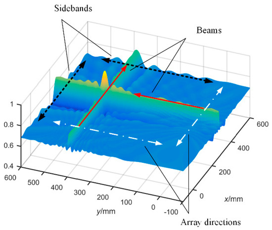 A three-dimensional localization diagram is shown in Figure 7, from which the beam characteristics of the proposed method can be observed. The array directions marked by white arrows are the location of linear sensor arrays. There are two beams perpendicular to the two arrays respectively, and the power of the entire beam is higher than the power of other regions. Therefore, one beam can clearly localize one coordinate of the AE source in the array direction, which means that the two perpendicular beams are able to determine the position of the AE source. However, there is no need to find out the complete two beams; the marginal profile (Sidebands) which is perpendicular to the beams is enough to localize the source position. It can greatly increase the localization efficiency. The flowcharts of BBM and FBBM are compared in Figure 8.