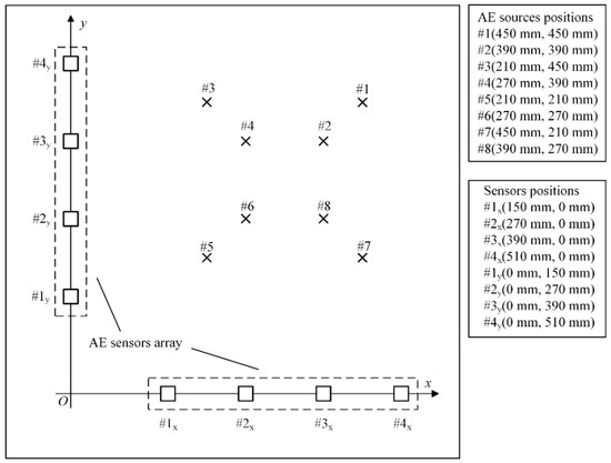 Figure 3 shows the position of two perpendicular linear sensor arrays in a Cartesian coordinate system. The excitation positions of the damage sources at four different points are plotted in Figure 3.
