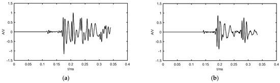 Due to the dispersion and energy attenuation phenomena of the propagating AE wave, the excited transient triangular wave expands to a broadband signal through a complex propagation process. The time-domain waveform and frequency spectrum of the signal after propagating about 400 mm with a center frequency of 150 kHz are shown in Figure 4.