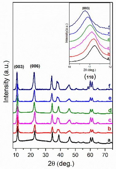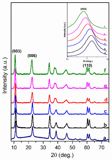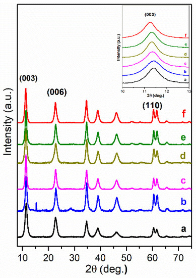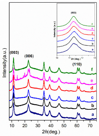 XRD patterns of Mg3/Al-CO3 layered double hydroxides (LDH) (a) and Mg3/Al-CO3 intercalated with organic anions: Mg3/Al-succinate (b), Mg3/Al-malonate (c), Mg3/Al-tartrate (d), Mg3/Al-laurate (e), and Mg3/Al-oxalate (f).