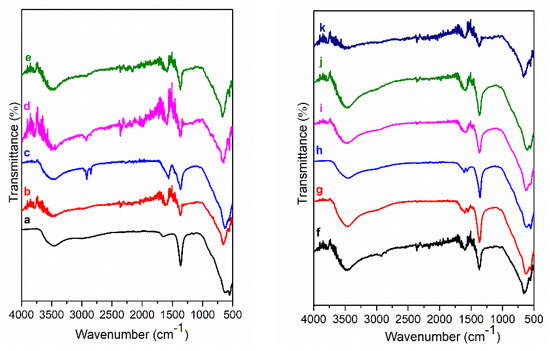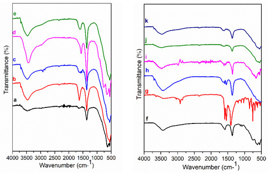 FT-IR spectra of Mg3/Al-CO3 (a) and hybrid inorganic-organic LDHs: Mg3/Al-oxalate (b), Mg3/Al-laurate (c), Mg3/Al-succinate (d), Mg3/Al-malonate (e). FT-IR spectra of Mg3/Al-tartrate (f), Mg3/Al-4-biphenylacetonate (g), Mg3/Al-benzoate (h), Mg3/Al-1,3,5-benzentricarboxylate (i), Mg3/Al-4-methylbenzoate (j) and Mg3/Al-4-dimethylaminobenzoate (k).