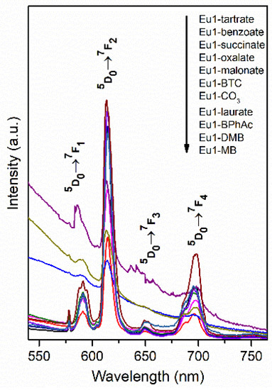 The emission spectra obtained at room temperature of Mg3/Al0.99Eu0.01 and Mg3/Al0.99Eu0.01 samples intercalated with benzoate, oxalate, laurate, malonate, succinate, tartrate, 1,3,5-benzentricarboxylate (BTC), 4-methylbenzoate (MB), 4-dimethylaminobenzoate (DMB) and 4-biphenylacetonate (BPhAc) anions (λex = 394 nm) are presented in Figure 8. The emission spectra of Mg3/Al0.99Eu0.01—organic anion LDHs show four main emission lines between 550 nm and 740 nm. All observed emission bands are due to 5D0–7FJ (J = 1, 2, 3, 4) transitions of Eu3+ ions. According to the literature, the emissions are 5D0→7F1 (590 nm), 5D0→7F2 (613 nm), 5D0→7F3 (650 nm) and 5D0→7F4 (697 nm) transitions typical of Eu3+ ion []. The Eu3+ ions occupy a low-symmetry site, since the emission due to 5D0→7F2 transition is the strongest. Moreover, the results obtained indicate that the excitation energy to the Eu3+ ion in most of the cases is transferring from the organic anion ligands increasing the intensity of emission of the LDHs. Two mechanisms of intramolecular and intermolecular energy transfer between lanthanide ions and organic molecules have been suggested []. As was stated in [], the intensity of emission of lanthanide distributed in host matrixes is affected by the energy matching degree between organic ligands and lanthanide ions. Evidently, when the energy matching degree is better, the energy transfer efficiency is higher and, consequently, the emission intensity of the compound is higher. The potency to absorb the UV radiation by interlayer organic anions and possible transfer this energy to the Eu3+ center by the interaction between the carboxyl oxygen of the intercalated anions with the hydrogen of the M(OH)6 octahedra via a hydrogen bond was suggested. The tartrate and benzoate having the strong basicity, showed higher ability to absorb the light []. Carbonate is a weaker base, thus transferring less energy to Eu3+ ions. The aromatic ring in the benzene can also influence the levels of resonant energy of lanthanide ions. As we can see from emission spectra the Mg3/Al0.99Eu0.01-tartrate and Mg3/Al0.99Eu0.01-benzoate LDHs show the highest emission intensity to compare with LDHs containing other organic ligands. Carboxylate and carbonyl groups connected with aromatic ring usually decrease the intensity of emission. The energy matching degree in the benzoate and Eu(III) complex obviously should be enhanced influencing the intensity of emission []. Moreover, the bridge of methylene groups -CH2- can break up the conjugated π-electron system [].