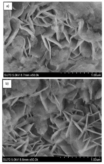 SEM micrographs of Mg3/Al-CO3 (a) and Mg3/Al0.99Eu0.01-CO3 (b) LDHs.