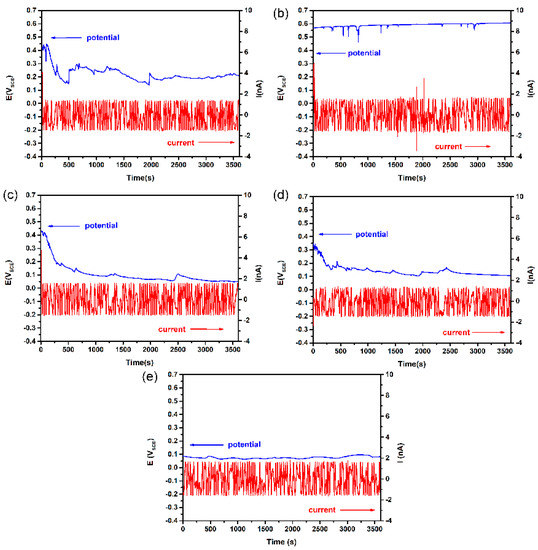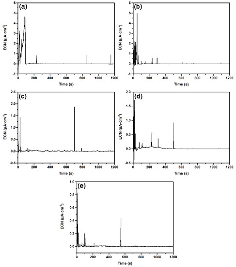 Typical EN time records of different surface roughness specimens of DSS 2205 at 200 mV (SCE) in NaCl solution at 55 °C: (a) 180#; (b) 600#; (c) 1000#; (d) 2000#; (e) polished.