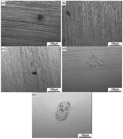 Optical microscopy images of the pits on different surface roughness specimens after EN measurement in 10% FeCl3 solution at 50 °C: (a) 180#; (b) 600#; (c) 1000#; (d) 2000#; (e) polished.