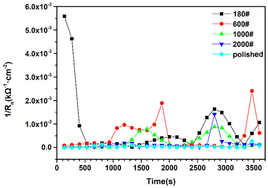 where σE is the standard deviation (SD) of the noise potential and σI is the SD of noise current. Rn is thought to be equivalent to the polarization resistance Rp [19], assuming that the difference in the effective frequency at which Rn and Rp are measured is negligible [20]. The frequency used in this measurement was not close to that used in normal Rp measurement, but Rp can still be estimated with a reasonable error [21]; therefore, Rn is comparable to Rp and reflects the corrosion resistance on the material surface. The reciprocals of calculated Rn of different surface roughness specimens are presented in Figure 4. The 1/Rn data characterized the change in corrosion rate on the sample surface during the measuring time. It was observed that the specimen with the polished surface presented the lowest 1/Rn value, at 4.6 × 10−5 kΩ−1·cm−2, and the smallest amplitude fluctuation, suggesting that pit growth did not emerge frequently on the smooth surface. In contrast, the 180# specimen showed a higher corrosion rate at the beginning of the measurement, which declined quickly, indicating a combination of pit initiation and repassivation. Moreover, in the latter half of the recording, the 1/Rn value of the 180# specimen rose to 1500 kΩ−1·cm−2 and remained at the same level, which is indicative of stable pit growth. The corrosion rate of 600#, 1000#, and 2000# specimens reveal a trend similar to that of the 180# specimen, but slower as the surface became smoother. The variation of 1/Rn implies that lower surface roughness has a positive effect in enhancing the pit corrosion resistance of DSS by reducing the probability of stable pit growth. This is similar to the trend of austenite stainless steel, indicating that mechanical grinding has the same effect on the pitting corrosion resistance of DSS, although it has the particular dual-phase structure.
