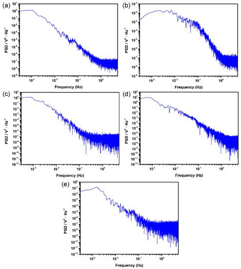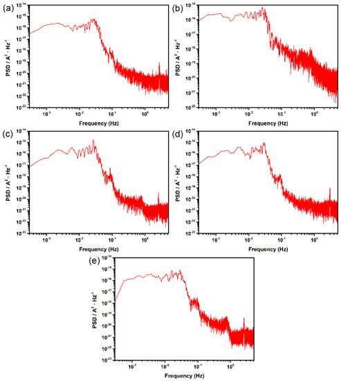 For more information on localized corrosion, the frequency domain analysis of potential and current signal was conducted. The power spectral density (PSD) of potential and current noise during the whole immersion time (3600 s) was calculated by fast Fourier transform (FFT) with “Hanning” window, as shown in Figure 5 and Figure 6, respectively. It can be seen in Figure 5 that current PSDs among different surface roughness specimens present similar values and trends, which are consistent with the results obtained from the preceding time domain analysis. In addition, the cut-off frequencies of the current PSDs are around 2 × 10−2 Hz, and a low-frequency plateau of white noise is evident in the plots.