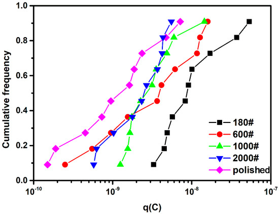 This parameter can estimate the mass loss in each metastable pitting pulse, and therefore reflect the pit growth process under different surface conditions. The cumulative frequency of q is presented in Figure 8. Clearly, the average value of q decreases in the order 180# > 600# > 1000# > 2000# > polished, and difference in q between the roughest and smoothest specimen is higher than one order of magnitude. Hence, a rougher surface provides a higher probability for a metastable pit to propagate larger in size and transition to a stable pit on DSS. Nevertheless, the q values for 600#, 1000# and 2000# samples still provide relatively poor distinctions between them. In summary, the short noise analysis parameter q can characterize the facilitation effect of a rough surface on the pit growth process of DSS 2205, which is similar to austenite stainless steel, but the discrimination ability needs to be improved by optimized statistical analysis.