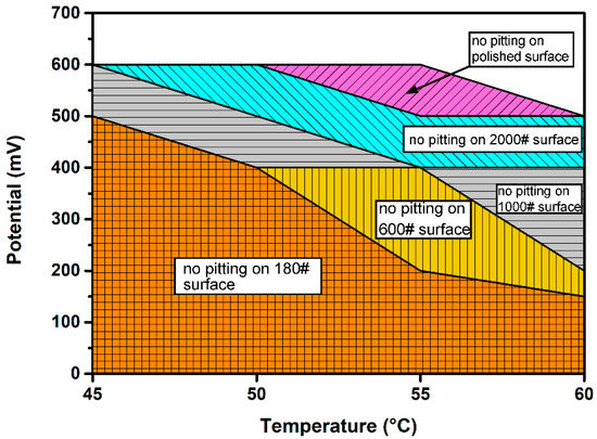 In addition, it was observed that rougher surface increased the frequency of metastable pitting increased at given temperature. Herein, the average N of the 180# specimen was more than seven times of that of the surface-polished specimen at all four testing temperatures. The values of N for other surface roughness specimens were intermediate and decreased with the successive increase in grit number. It is generally believed that a cruder surface morphology possesses a larger quantity of more occluded defective sites, in which it is easier to maintain an aggressive local environment [31]. As a result, the critical concentration Ccrit for pit nucleation is easier to be satisfied in these sites. By virtue of this, a rougher surface condition specimen has a higher probability of pitting nucleation, i.e., a higher metastable pitting rate in this work.