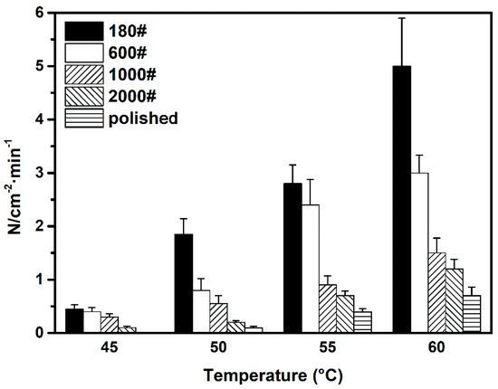 The metastable pitting rate N can be defined as the number of metastable pits per unit area per unit time and is used to characterize the pitting initiation rate of the material. The calculated results of DSS 2205 specimens of different roughness are presented in Figure 11. For all specimens, the current transients occur more frequently at higher temperature. A remarkable increase from 0.3 to 5.0 min−1·cm−2 of N on the 180# specimen was observed. Even for the polished specimen, there was a less obvious increase of 0.5 min−1·cm−2.