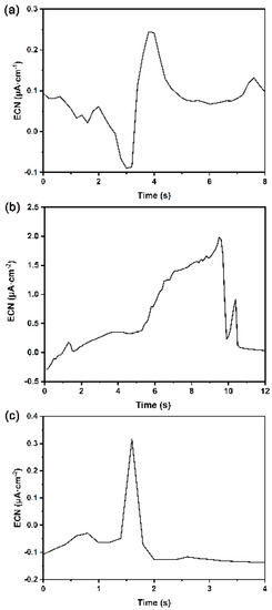 According to the current transient time records shown in Figure 10, three different types of ECN transients were observed and their typical shapes are summarised in Figure 12.