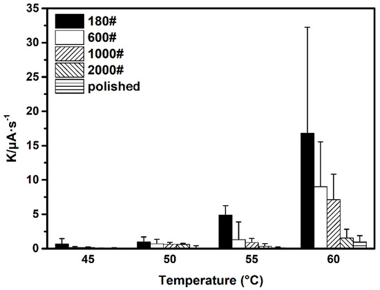 where n ≥ 1, I is the pitting current of a single pit, and t is the pit growth time. Considering the short duration of the ECN transient, the calculation of κ can be simplified by dividing the peak current value of the type II transient by the time taken to reach it [9]. Herein, the average metastable pitting growth rates (Κ) of different surface roughness DSS 2205 specimens at four temperatures and their SDs were calculated, and the results are illustrated in Figure 13. It is observed that metastable pit growth rate is clearly temperature dependent. The value of K at 60 °C is at least 20 times that at 45 °C for all roughness specimens. The increase of K can be ascribed to the positive effect of temperature on the electrochemical dissolution process of a metal, based on the Arrhenius equation (as shown in Equation (5)). In addition, the influence of temperature on ion transportation also contributes to the change of K. The rise in temperature accelerates the migration of chloride ions into the pit and consequently promotes metastable pit growth [34].