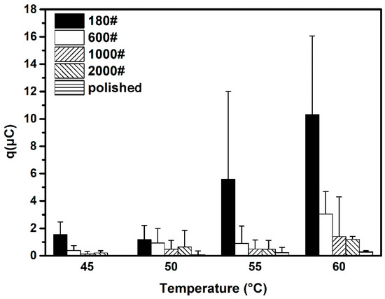 The calculated average charge quantity q of the ECN transient is shown in Figure 15. As can be seen, at temperatures below 55 °C, the 180# specimen and the polished specimen exhibit the largest and smallest charge quantity, respectively. However, no remarkable difference between q values of 600#, 1000# and 2000# specimens is observed; when temperature increases to 60 °C, the difference in q between 600#, 1000# and 2000# specimens also increases. These observations indicate that metastable pit size increases on surfaces with greater roughness. Additionally, the highest SD of q is again observed on the 180# grit specimen at all test temperatures: from approximately 1 μC at 45 °C to 6 μC at 60 °C. In contrast, the 2000# and polished specimens show marginal SD values of q. Accordingly, the SD of charge quantity also showed an increasing trend as surface roughness increased.