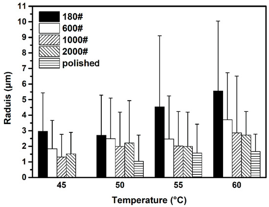 In order to understand more directly the influence of surface roughness on metastable pit size, the average radius of metastable pits on specimens at different temperatures was calculated, as shown in Figure 16. A similar varied trend in metastable pit size can be observed from the calculated radius results. It is also observed that the radius of metastable pit is in the range of 1 to 10 μm, indicating that a metastable pit with greater radius may transition to a stable one; on the other hand, the shorter-radius metastable pits are hard to distinguish from the background current noise. The SD of the metastable pit radius still increased on rougher surfaces as well, but the values were all of the same order of magnitude.