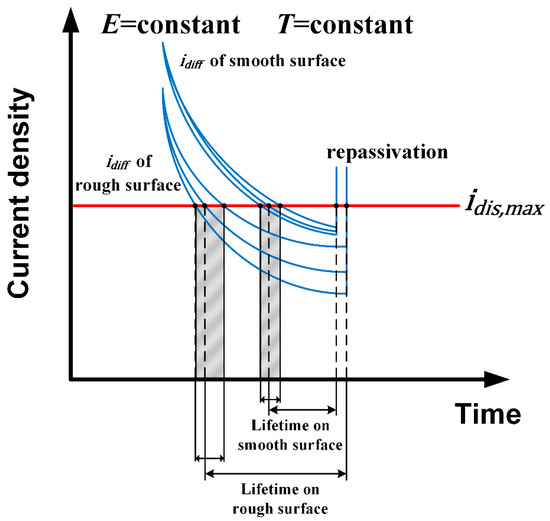 Schematic presentation of the relationships between surface roughness, idiff, idis,max, and lifetime of a metastable pit.