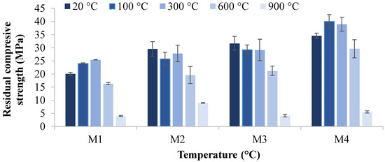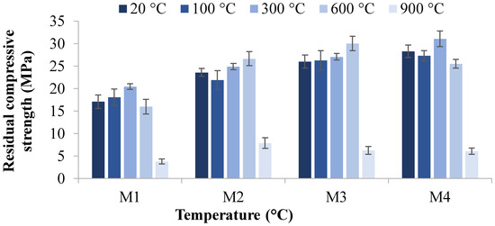 Similarly, as shown in Figure 5, after being exposed to a temperature of 100 and 300 °C, all tested specimens exhibited an increase in compressive strength in the 28-day sample testing. Interestingly, samples at 600 °C exhibited enormous micro cracks on the surface but still retained significant compressive strengths. The sintering process may be considered the main reason for keeping strength even with microcracking on the surface of samples at 600 °C. Moreover, it was found that the compressive strengths of all mixes were severely reduced when samples were exposed to 900 °C, developing macro-cracks due to the destruction of the cellular structure of the geopolymer [39,67].