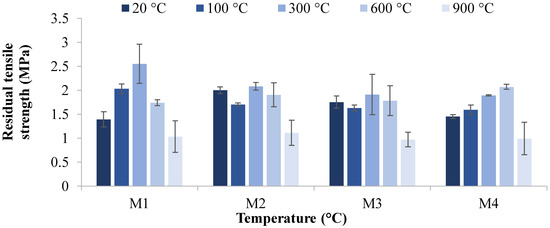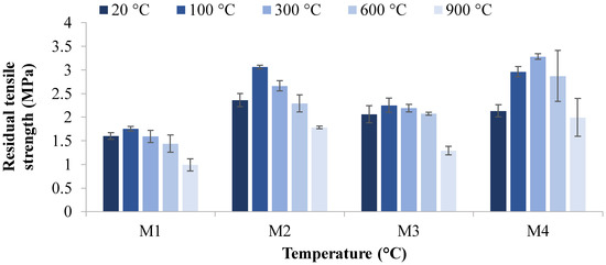 The residual compressive strength and residual tensile strength at 20, 100, 300, 600, and 900 °C temperatures are given in Figure 4, Figure 5, Figure 6 and Figure 7. The residual flexural strength at 20 °C is shown in Figure 8.