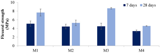 Figure 8 shows the effect of aggregate replacement on the flexural strength of the geopolymer samples at 20 °C. There was no clear trend occurring in this set of results. The 0% aggregate replacement after 28 days showed a drop in flexural strength with 50% magnetite aggregate replacement. This then increased with 75% (M3) magnetite replacement and dropped again after 100% (M4) magnetite aggregate replacement was achieved. The lowest flexural strength after 28 days occurred with 100% magnetite aggregate replacement and only reached about 4.5 MPa. However, the highest flexural strength of 8.6 MPa was achieved by the M3 samples.