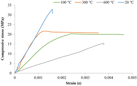 The compressive stress–strain curves for the mixes M2, M3, and M4 at 20, 100, 300, and 600 °C for 28 days are shown in Figure 9, Figure 10 and Figure 11. The stress–strain curves at 900 °C were not examined because the strain gauges could not stick properly to the samples due to their softness and cracks.