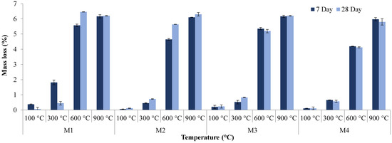 Once moulds reached their designated curing ages, they were removed from the curing room and weighed before being placed into a furnace for heating. Specimens were then heated at 5 °C/min to 100, 300, 600, and 900 °C, similar to [59,60], and removed from the furnace. The samples were then weighed again and observed for any spalling that may have occurred during the heating process. The measurement of the mass of samples before and after heating was done in accordance with AS-1012.12.1 [61]. The recorded weights were then used to determine overall mass loss at each temperature. This process was conducted for the control mix M1 and repeated for M2, M3, and M4. Spalling of the specimens was physically observed for the formation of cracks, loss of parts, and holes. The effects of spalling vary depending on the purpose for which concrete is used.