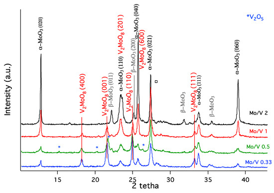 Another interesting feature revealed by the Mo/V = 2 sample is the co-existence of the monoclinic β-MoO3 with α-MoO3 phase mainly orientated in the (0X0) direction ((020), (040), and (060) planes). This is quite unusual behavior for α-MoO3 crystals, which are obviously highly anisotropic. Such a phase growth has also been reported for MoO3 prepared via physical methods as sputtering [33], pulsed electron beam deposition [34] or the evaporation-induced self-assembly process [35]. For Mo/V ratio of 1, the anisotropic α-MoO3 character is re-established. To sum it up, for the formation of a mixt phase, containing V and Mo, a certain Mo/V ratio is needed (i.e., <0.5).