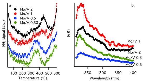 Furthermore, these results can be used to distinguish between Brønsted or Lewis sites. As reported in literature, the low-temperature desorption peak, below 350 °C, corresponds to the NH4+ desorbed from Brønsted acid sites, while the Lewis acid–coordinated sites correspond to NH3 desorbed at higher temperature [37]. In this regard, it is obvious that the catalysts with low Mo/V ratios present higher amounts of Brønsted acid sites, while by increasing the Mo loading the amount of Lewis type sites became preponderant.