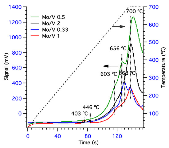 With the scope to have more information about the reducibility of our samples, temperature programmed reduction in hydrogen flow was conducted (Figure 3). The samples Mo/V = 2 and Mo/V = 1, with the highest amount of Mo, present one reduction peak at low temperature. This reduction peak can be associated with the reduction of octahedrally coordinated Mo6+ to Mo4+ [43], but it is also possibly due to the reduction of isolated V2O5 to V2O3 [44,45,46]. Even though V2O5 was not evidenced in XRD, isolated V5+ species cannot be excluded for the samples Mo/V 2 and 1. However, all samples present a shoulder at ~600 °C, which can also be related to the reduction of V5+ from the surface. In the particular case, for Mo/V = 1 sample, the reduction peak corresponding to V5+ reduction is shifted to higher values (627 °C) and it is broader, indicating a higher interaction of the V5+ with its neighbors and/or possibly the existence of two overlapping peaks (V2O5 and V2MoO8). Higher temperature reduction peaks, in the range of 650 to 670 °C, shown only for the sample with high V content (Mo/V = 0.33 and 0.5) can be correlated with the reduction of V5+ species strongly interacting with Mo in the V2MoO8 phase reduction [43]. It is worth mentioning that this phase was evidenced mainly in the sample with a high V content (from XRD), although this phase is also present in the Mo/V = 1 sample. The reduction peak at 700 °C, present in all samples, could be correlated with the octahedral Mo4+ to Mo0 reduction as well the contribution of the reduction of the tetrahedral molybdenum species Mo6+ to Mo4+ [47], either from V2MoO8 or MoO3 phases. Both configurations were evidenced by the UV–VIS analysis.