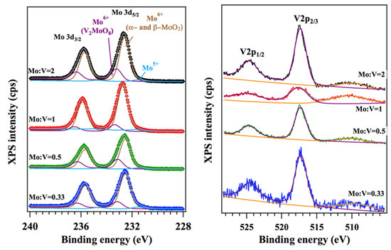 The comparison of XPS with the analytic Mo/V ratios has shown a superficial increase in the Mo species, at the surface, for all the samples. This may also be associated with the agglomeration tendency of vanadium species [52] in the subsurface.