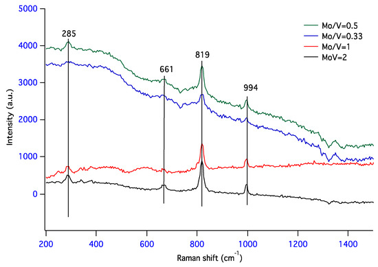 Additional information regarding the structure of the molybdenum–vanadium mixed oxides was obtained using Raman spectroscopy. Figure 5 presents the Raman spectra of the studied samples with different Mo/V ratios. Irrespective to the Mo/V ratio, all spectra are presenting three Raman peaks: (i) a sharp peak at 994 cm−1 that can be assigned to stretching vibration of Mo=O mono-oxo molybdenum oxide species [53] or to hydrated decavanadate species [54]; (ii) a very well-defined peak at 819 cm−1 originated from stretching vibrations of Mo–O–Mo groups, and (iii) a weak peak at 661 cm−1 characteristic to the vibrations of Mo2O2 units formed by edge shared MoO6 octahedra from α-MoO3. In the samples with high vanadium loading (Mo/V = 0.33 and 0.5) the presence of a small band at around 775 cm−1 can be observed, which is related to the presence of V–O–Mo vibrations for molybdovanadate species [55] from V2MoO8. The existence of this phase was also evidenced by XRD analysis. The bands in the low Raman shift region are indicative of the presence of hydrated decavanadate species [54] or the presence of trace amounts of V2O5 [56]. No band at ~1030 cm−1 was evidenced in Raman spectra, which indicates that no isolated vanadia species or V=O stretching modes of surface vanadia are present in these samples, irrespective to Mo/V ratio.