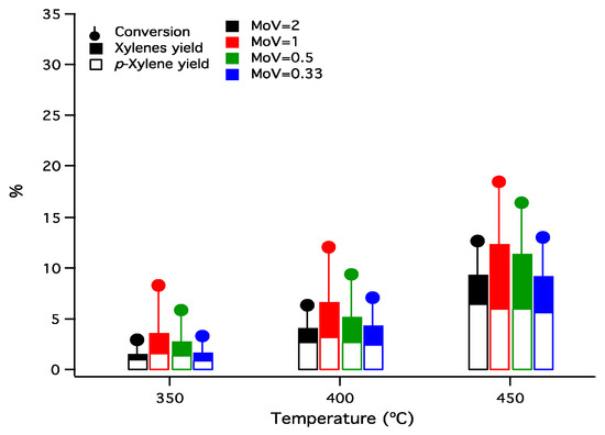 The yield to xylenes gathered in Figure 6 increases with the reaction temperature for all samples. The highest yield in xylenes (13%) was obtained for Mo/V = 1 catalyst at 450 °C. Regardless of the reaction temperature, the xylenes yield increased in the following order: Mo/V =2 < Mo/V = 0.33 < Mo/V = 0.5 < Mo/V = 1, the same order as the toluene conversion. The yield in p-xylene is depicted in Figure 6, showing that its production follows, in general, the total yield to xylenes profile.