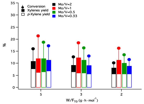The effect of W/FTο on toluene conversion and yield to xylenes is presented in Figure 7 (W—weight of catalysts, FTο—inlet molar flow rate of toluene). For the same temperature (450 °C), the conversion of toluene increased with W/FT0 for all Mo/V ratio. The conversion and yield to xylenes reached maximum over Mo/V = 1, irrespective to the W/FTο ratio. However, the best W/FTο ratio is 5 g·h·mol−1.