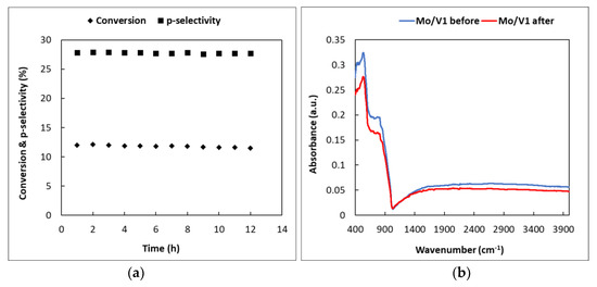 (a) The effect of the reaction time on the conversion of toluene and selectivity of p-xylene over Mo/V = 1 catalyst (temperature 400 °C, N2/toluene molar ratio 4, N2 flow rate 50 mL·min−1, catalyst weight 0.1 g); (b) FTIR spectra of the molybdena–vanadia catalyst before and after the catalytic test.