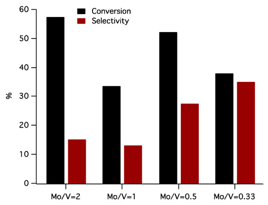 The highest toluene conversion by selective oxidation was achieved using Mo/V = 2 as catalyst (58%), and the series varies in the following order Mo/V = 2 > Mo/V = 0.5 > Mo/V = 0.33 > Mo/V = 1. This behavior is opposite compared to that evidenced for the toluene disproportionation, and this is expected behavior, if we consider that the two reactions require different types of active sites (acid-base sites for disproportionation and redox sites for oxidation). Focusing on active sites needed by hydrocarbon oxidation, according to TPR measurements, the highest amount of reducible lattice oxygen is present in the sample Mo/V = 2 and 0.5, meaning a high activity of these samples, which are in perfect correlation with our results presented in Figure 9, (58% and 51%, respectively). Moreover, it is also well known that a catalyst with an active lattice oxygen can be detrimental to the selectivity in hydrocarbons oxidation due to an advanced oxidation of substrates [57,58,59,60], and this can explain why the best catalyst (in terms of conversion), Mo/V = 2 failed to provide a good selectivity also.
