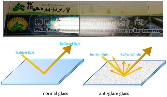 Mobile phones have become a necessity for life and attracted more and more attention. In terms of increasing portability, the mobile phones are requested to be lighter, thinner, and better texture. In addition, the requirement of mobile phones for entertainment is increasing day by day. Consequentially, the demand for visual and operational convenience is also relatively increasing, which in turn drives the smartphone technology to be constantly updated and makes the application field more extensive. Anti-glare treatment could reduce the high light intensity and glare caused by excessive concentration of light, thereby improving the user’s comfort for a cover lens. The mechanism of anti-glare is depicted in Figure 1.