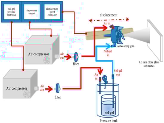The glass substrates with diameter of 100 × 100 mm and thickness of 3 mm were ultrasonically cleaned at 50 °C for 30 min and then baked at 80 °C for 1 h. The prepared silica sol-gel samples were deposited onto the cleaned substrates through an automated spray coating system, which was schematically shown in Figure 2. The operating variables of sol-gel deliver pressure, air transport pressure, and the spray gun displacement speed were investigated during the sol-gel deposition under one-pass spray operation conditions. The obtained silica anti-glare film/glass samples were heated at 180 °C for 1 h. In this work, the Auto-spray gun (S-710AD) was purchased from Guan Piin Painting Technology Co., Ltd. (Taiwan). This equipment provides the regulation of sol-gel deliver pressure, air transport pressure, and spray gun displacement speed to spray sol-gel materials on the substrates. Although the distance between the spray gun and substrates can be adjusted, however, for the simplicity of operation, this distance was kept constant in this study. The environmental temperature and humidity were well controlled at 25 °C and 40%, respectively.
