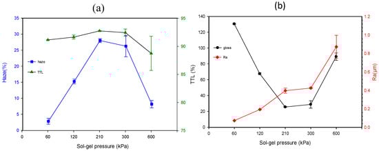 The influence of sol-gel deliver pressure on (a) TTL and haze (b) gloss and Ra with air transport pressure and displacement speed of 300 kPa and 300 mm/s, respectively.