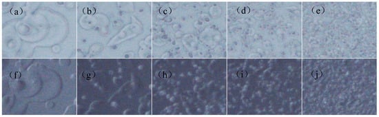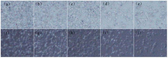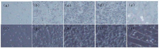 The digital microscope pictures of microstructure morphology of anti-glare samples by different sol-gel deliver pressure: (a) 60 kPa (90°); (b) 120 kPa (90°); (c) 210 kPa (90°); (d) 300 kPa (90°); (e) 600 kPa (90°); (f) 60 kPa (25°); (g) 120 kPa (25°); (h) 210 kPa (25°); (i) 300 kPa (25°); and (j) 600 kPa (25°) with air transport pressure and displacement speed of 300 kPa and 300 mm/s, respectively.