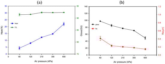 The influence of air transport pressure on (a) haze and TTL and (b) gloss and Ra with the sol-gel deliver pressure and displacement speed of 120 kPa and 300 mm/s, respectively.