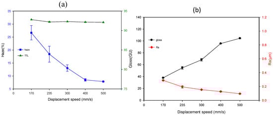 The influences of spray displacement speed on (a) haze and TTL, and (b) gloss and Ra with the sol-gel deliver and air transport pressures of 120 kPa and 300 kPa, respectively.