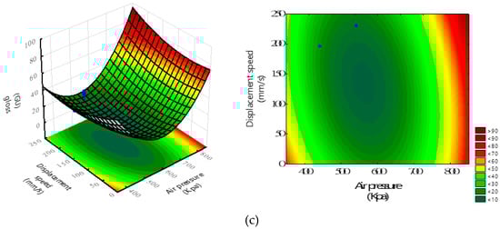 The response surface plots of gloss against the factors of (a) sol-gel deliver pressure (X1) and air transport pressure (X2) with X3 of 140 mm/s; (b) displacement speed (X3) and sol-gel deliver pressure (X1) with X2 of 560 kPa; and (c) displacement speed (X3) and air transport pressure (X2) with X1 of 250 kPa.