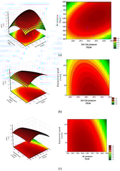 The F-value of the model is 17.8 with a corresponding p-value of 0.0011, indicating the significance of this model. The R2, R2adj, and R2pred are 0.964, 0.910, and 0.721. The predicted R2 is in reasonable agreement with the adjusted R2. These results also support the adequacy of the model. In addition, the F-value of the lack of fit is 17.666 (p > 0.05), which indicates that it is not significant and shows the adequacy of the model. From Table 8, the multiple regression and the analysis of ANOVA, it can be seen that the sol-gel deliver pressure (X1), air transport pressure (X2) and displacement speed (X3) all reach significant level (p-value < 0.05) in the linear terms, among which the most significant variable is air transport pressure (X2).