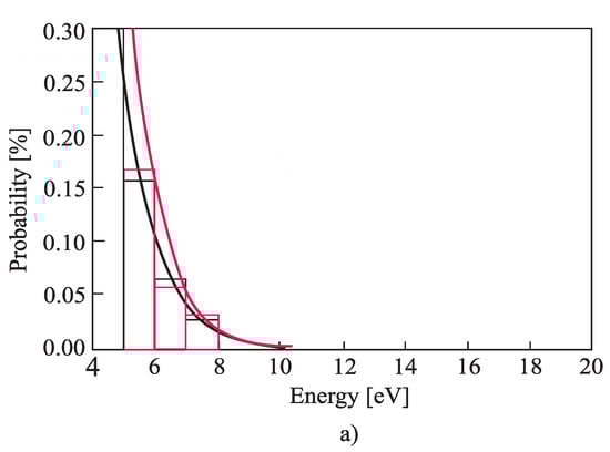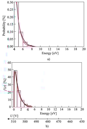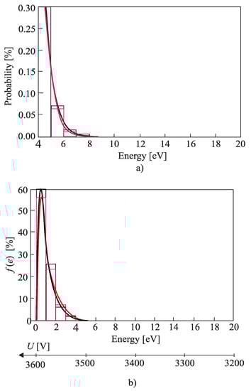 10]. In all examined cases, it was observed that the free electron gas spectrum belongs to the Maxwell distribution (i.e., the tail of the energy spectrum decreases proportionally to the exponent energy to the first degree, and not to the second degree that would correspond to the Druyvesteyn distribution). After this conclusion, it was possible to fit (using Equation (2)) the entire histogram of the impulse breakdown voltage values and obtain an analytical expression for the Maxwell distribution of the free electron gas spectrum.