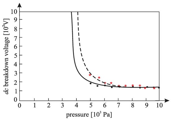 DC breakdown voltage versus the pressure of the gas (He). Experiments were performed with three cylindrical Alnico magnets in the cathode and with an inter-electrode distance of 0.5 mm. Experimental points are fitted using the Paschen’s curve with the inter-electrode distance as a parameter in the case of the existence of a magnetic field in the inter-electrode space. The same figures also show the theoretical Paschen’s curves obtained without a magnetic field in the inter-electrode space. The captions of the figures give the values of the best fit and the values calculated using Equations (6), (7) and (A16) (