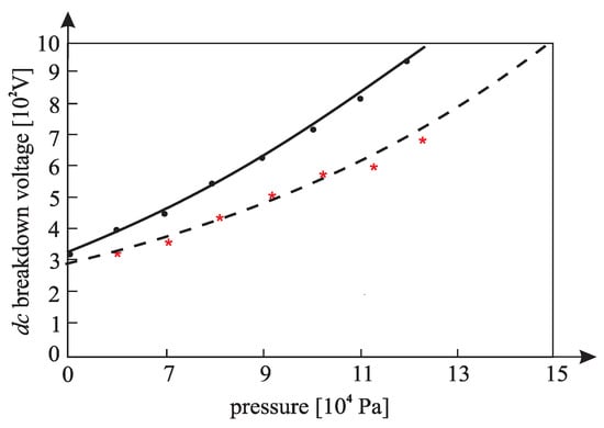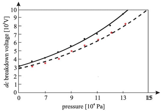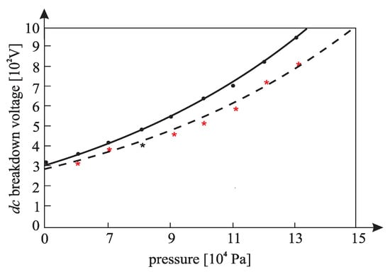 DC breakdown voltage; 2) 1000 values of the impulse breakdown voltage obtained by an impulse of 1 kV/s; 3) 100 values of the impulse breakdown voltage obtained by an impulse of 1 kV/μs; 4) repeating the previous measurements for a new pressure value; 5) adjusting the inter-electrode distance and repeat steps 1 to 4; 6) placing one form of magnet in the cathode and repeating steps 1 to 5; 7) placing two magnets in the cathode and repeating steps 1 to 5; and 8) placing three magnets in the cathode and repeating steps 1 to 5. A pause of 30 s was made between the two successive steps. The values of the inter-electrode distance were 0.1 mm, 0.5 mm and 1 mm. The pressure values were changed from 5000 Pa to 10,000 Pa with a step of 500 Pa, and also from 50,000 Pa to 150,000 Pa with a step of 10,000 Pa. At the points on the left side of Paschen’s minimum, additional