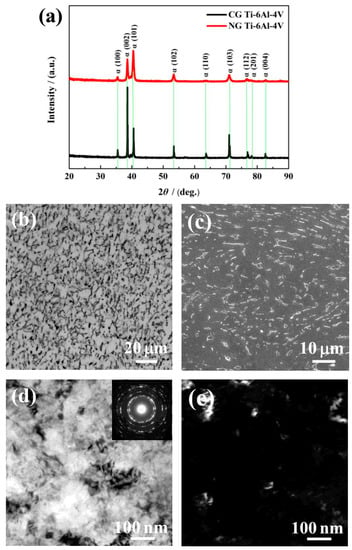 X-ray diffraction (XRD) patterns of nanograined (NG) and coarse-grained (CG) Ti–6Al–4V alloys (a). Optical micrograph (b) and SEM magnified images (c) for CG microstructure, TEM bright-field (d), and dark-field (e) micrograph for NG microstructure.
