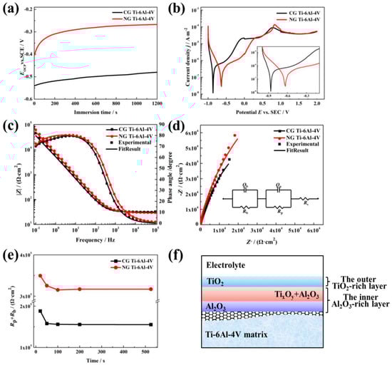 Open circuit potential (OCP) plots (a), PDP curves (b), Bode plots (c), and the corresponding Nyquist plots (d) of NG and CG Ti–6Al–4V samples in SBF solutions at 37 °C. Variation of Rp + Rb and testing time in applying passive potential (e), and equivalent electrical circuit (insert in (d)) with Rs(QpRp)(QbRb) model used to fit the impedance spectra. Schematic diagrams (f) of passive layers formed on NG and CG Ti–6Al–4V surfaces.